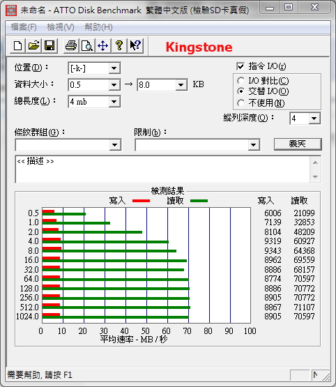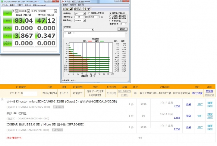 貼上我在P家買的兩張卡的測試結果用筆電的SD卡槽測試的結果如下:金士頓 microSDHC/UHS-I 32GB 高速記憶卡(SDCA10/32GB)TOPMORE 64GB microSDXC UHS-I Class 10 記憶卡同樣測試環境 金士頓那張寫的速度不到10M 遠小於廣告標榜的45M 所以今天給退了在收到Kingstone這張卡後,放到筆電內複製資料時,覺得比Topmore那張慢多了;這才測試一下的,沒想的差這麼多。另一張Topmore的表現就不錯,我在特價時買的 算是賺到了