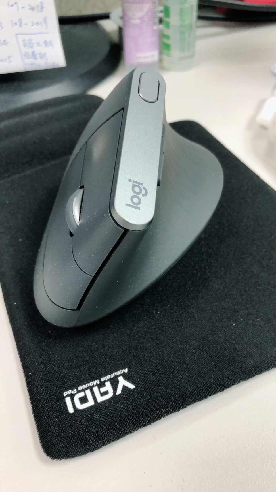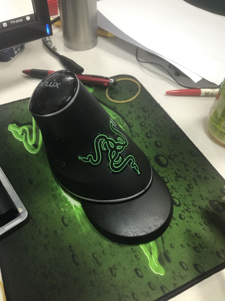 垂直鼠,我覺得像是飛行搖桿(可是同事說用起來像是晚上會偷偷摸摸上上下下手做的事),好用!主要是又不貴,無線的一台含運回台灣800元台幣有找,電池還是用3號電池一顆,也不重!不少垂直鼠光看貴貴的價格,還是讓手痛一下好了!貼紙是我亂貼的!