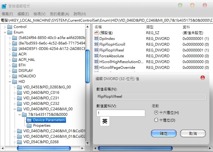 更改windows 滑鼠滾輪方向與MAC一致。1.裝置管理員>滑鼠及其他指標裝置>滑鼠>詳細資料>硬體識別碼2.打開regeditHKEY_LOCAL_MACHINE \ SYSTEM \ CurrentControlSet \ Enum\ HID \ XXX \ XXX \ Device Parameters 找到 FlipFlopWheel 修改為1。XXX\ 為硬體識別碼3.重新開機。