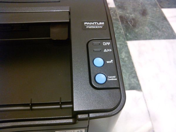第一個燈顯示出紙和網路連線,第二個燈則顯示卡紙和待機狀態。然後是Wifi鍵,最後一個按鈕是「Cancel/Continue(取消/繼續)」。