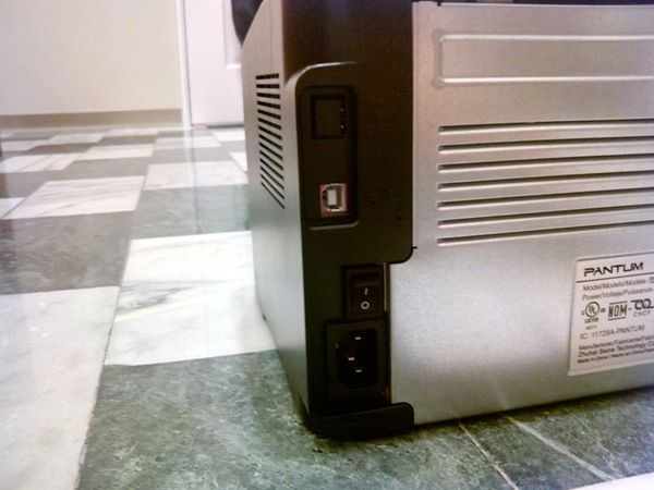 印表機左後側的接孔。上面網路孔應該是用不到。第二個是USB插孔,再往下是電源開關和AC電源孔。