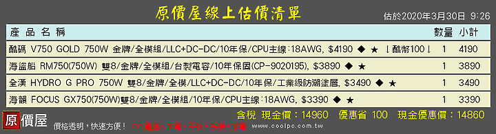 小弟去年底電腦換了新的配備 於前陣子發生電腦開機困難 要等好久才會開機 最後確定是電供問題 振華的 750W鈦金 用了大概3個月就出問題 我也懶得送修了 看了幾個品牌的 , 本來想買 antec 的 HCP 850W , 結果說調不到貨了... 爬了文看了下 : 酷媽的 V系列 PLATINUM 海盜的 AX系列 海韻的 PRIME SSR-TR系列 想請問大大們 這幾顆牌子的電供有沒有比較推薦...沒問題的 = = 謝謝大家~ ===0402更新=== 最後換了酷媽的 V系列 PLATINUM 最後合影 謝謝大家~