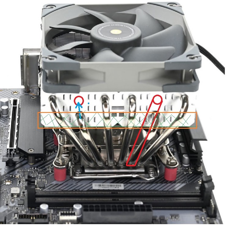 ▼散熱器熱導管與記憶體插槽之間還有一段距離,不會造成干涉