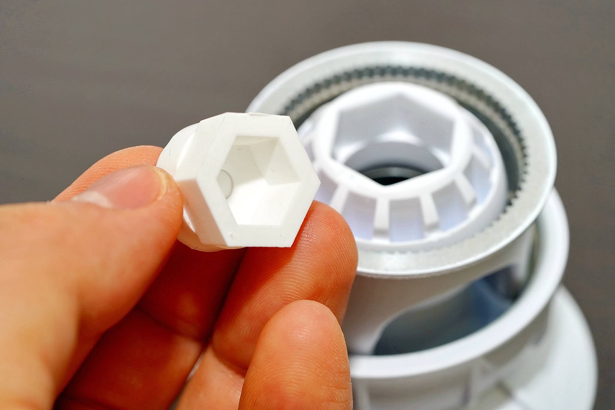 這個防水塞是可以完全拆下的,全新的元件要拿剪刀把中心部位剪開才好讓網路線穿過。
