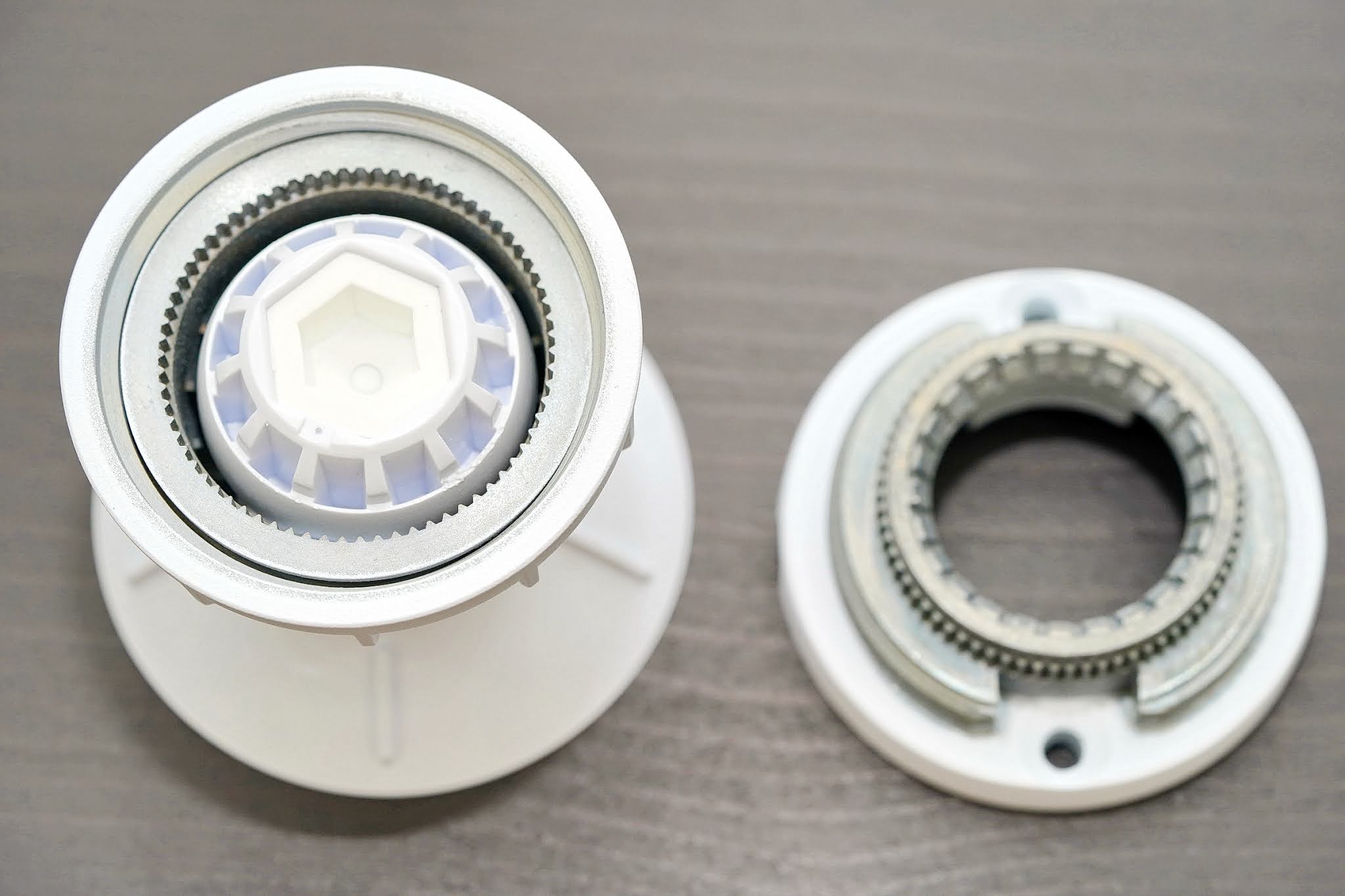 萬象關節的球座分為兩半,球座上半套在球體上,球座下半是以可拆卸方式和球座上半螺鎖。