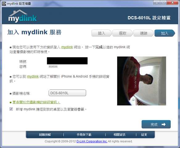 在這個畫面,你可以更改攝影機名稱,並選擇將mydlink捷徑加到桌面及瀏覽器書籤中。最後,按下"完成"按鈕,就會自動開啟瀏覽器到mydlink網站。