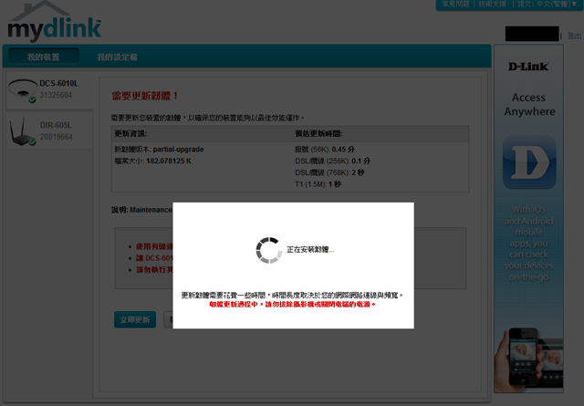 登入後,在我的裝置下選擇DCS-6010L,就看到更新韌體的提示。