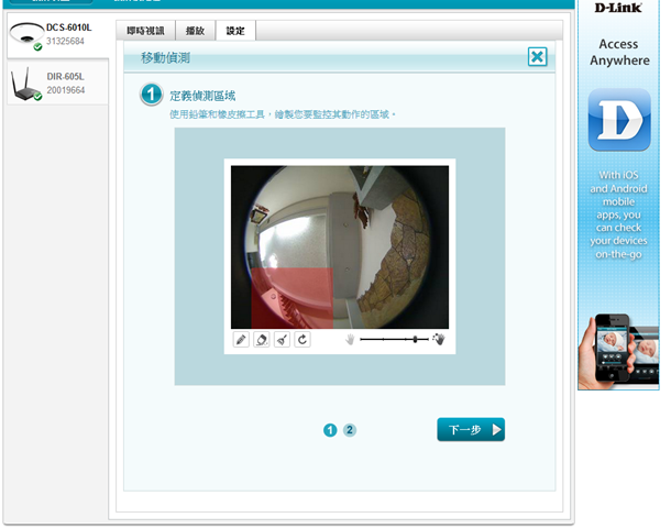 我先來設定移動偵測選項。首先,框出要監控移動偵測的區域,按下一步。