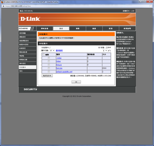 我將microSD卡裝入DCS-6010L後,重新回到此畫面,就會顯示SD卡中的目錄結構。接著,按下"格式化SD卡"按鈕,重新格式化這張microSD卡。