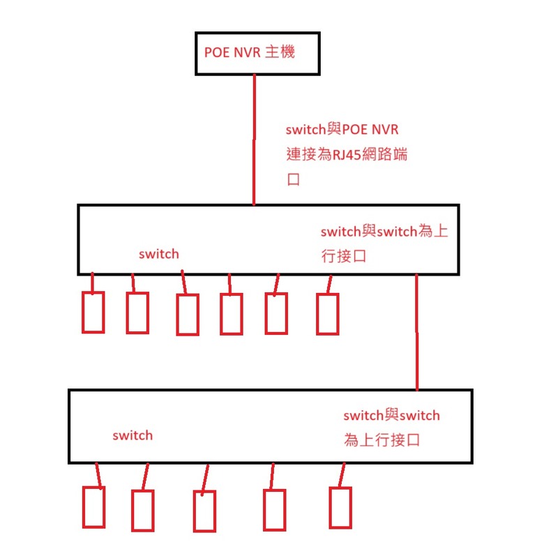目前的布線圖,現在因水晶頭不足,還沒插網線,如需插路由器網線,路由器會與switch 做連結。因為第一次裝POE的,請問POE 接口,無法串接switch一定要RJ45接口才有辦法嗎~ 謝謝,另外關於IP問題,如果插上路由器網線是否能解決呢,謝謝