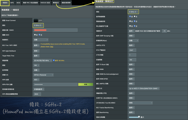7/23更新:感謝Mobile01 ID:騎狗去撞車 大大,分享了他自己ASUS GT-AX11000 PRO的WiFi設定圖,按照,騎大設定後,WiFi速度,穩定又快速了!以上圖片,更新於112/7/23!5GHz-1 - 設定圖:手機跟平板都連這組WiFi頻段5GHz-2 - 設定圖:HomePod mini獨立在5GHz-2頻段使用2.4GHz - 設定圖:小米檯燈、Dyson電風扇..等等設備