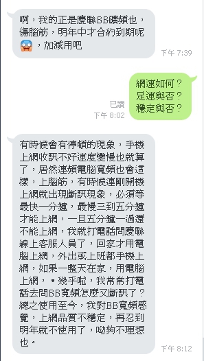chih_haohung wrote:也是這就是bb寬頻...(恕刪) 看樣子這樣的藍海策略是非常成功的─業者成功讓用戶要嘛認賠忍痛殺出,要嘛認賠忍痛用滿。朋友家是慶聯bb,在此分享他的使用心得就是忍痛用滿,1050327截圖如下供參: