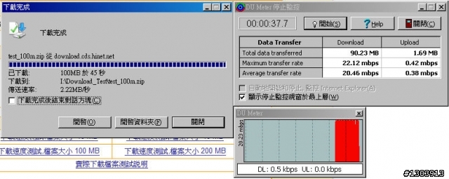 瀏覽器只計算傳輸檔案的時間,所以速度會比 DUMeter 看到的來得少,DUMeter 測到的才是比較正確的。