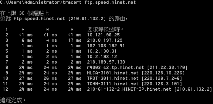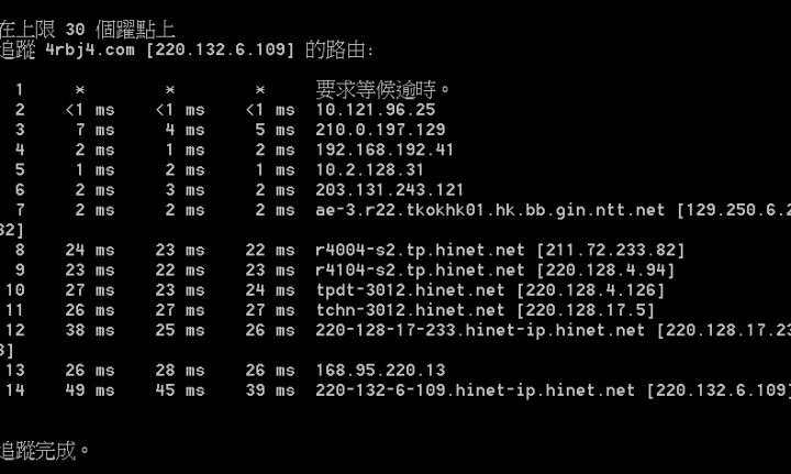 licson wrote:我的IP是210.0.197.223,請問大家可以幫忙traceroute一下嗎?另外,我用的是HGC和記環球電訊,好像有跟Hinet對接的……...(恕刪) traceroute 的目標應該是要指向台灣端接收檔案的目的地IP,例如從 210.0.197.223 傳送檔案給台灣某HiNet用戶,該用戶的連線IP是 36.233.9.1,香港這邊要 tracert 36.233.9.1 和 pathping 36.233.9.1,台灣這邊則要 tracert 210.0.197.223 和 pathping 210.0.197.223,以此類推。