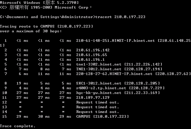 notebook18k wrote:Dr.Speed 的...(恕刪) 阿... 這裡是我的traceroute我的IP是210.0.197.223,請問大家可以幫忙traceroute一下嗎?另外,我用的是HGC和記環球電訊,好像有跟Hinet對接的……