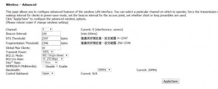 taotu wrote:P880或P880 2T2R,我都有設備可以測試,手機我有華為榮耀3C,HTC蝴蝶機,想問的是P880要發揮2T2R的優點有什麼特別設定嗎?還是都用預設設定即可?是說設備也要有特別支援2T2R才能發揮到極致?我有試著去調40HMz之類的設定,但似乎都沒有什麼特別強的樣子。 ...(恕刪) P880 2T2R版的Bandwidth改為40MHz、Control Sideband改為Upper、加密模式設定為 WPA2-PSK + AES only(不要選 TKIP+AES混合),應該可以跑到50Mbps上下。但使用40MHz時,受到環境訊號干擾的機率比較大,若周圍有其他的2.4GHz無線基地台(或無線產品)使用相同的頻道,引發訊號干擾,無法運行40MHz時,連線速度還是會下降。如果家裡有筆電/桌電的無線網卡是支援 802.11n、300Mbps,在調整設定後,去看「無線網路連線 狀態」顯示的速度是否為 300.0 Mbps,就知道能不能運行40MHz了。