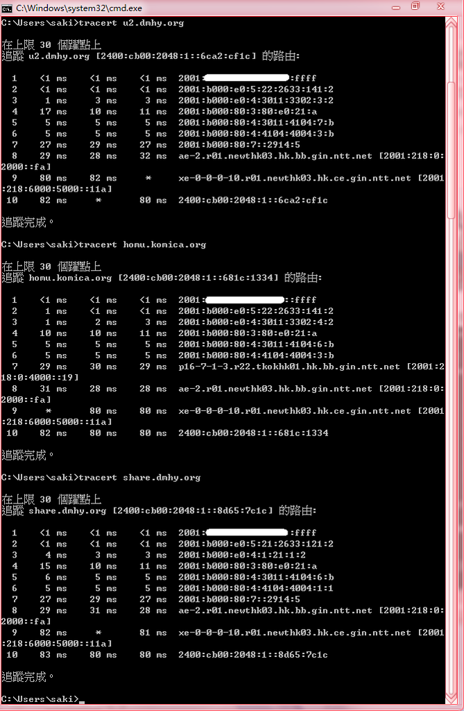 追蹤路由是到xe-0-0-0-10.r01.newthk03.hk.ce.gin.ntt.net [2001:218:6000:5000::11a]開始有 [*]沒有回應狀況所以才懷疑網站pinghomu.komica.orgu2.dmhy.orgshare.dmhy.org恩...