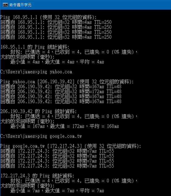 --- 168.95.1.1 ping statistics --- 10 packets transmitted, 10 packets received, 0% packet loss round-trip min/avg/max = 4.603/4.795/5.485 ms