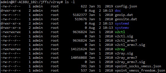 v2ray 目錄總容量為 51.9M。如果只安裝 V2Ray,可考慮放在 JFFS。