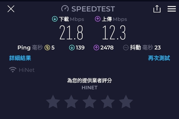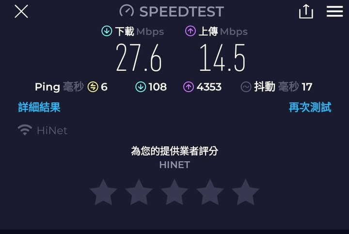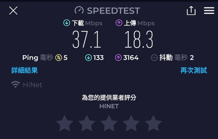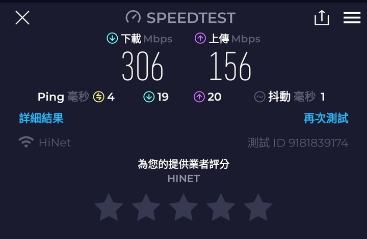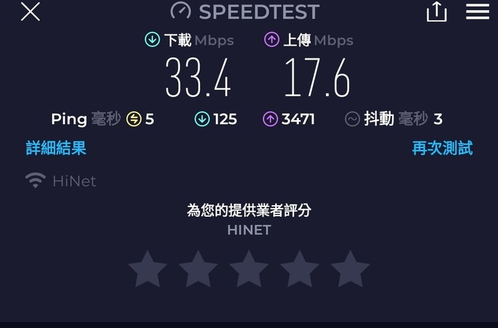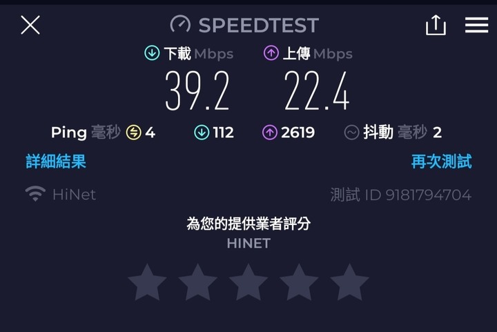 我是申辦300m/150m。小烏龜在三樓,光纖走戶外牆壁,由冷氣管旁進來。小烏龜再出去,一條網路線,由三樓冷氣孔旁出,網路線走戶外往下,由二樓冷氣管旁進來,連接在二樓的全屋通,以及MOD機上盒。在三樓最後面的房間,手機三次,測得的數據如下。已經足夠手機使用了。在而位於正上方的四樓,手機測得數據如下。以上數據是,相隔兩個樓地板。上圖是在裝置全屋通的,二樓前面房內測得。小烏龜----全屋通----MOD---電視。網路線是中華電信佈置,也是由其所提供。雖說全屋通還有,一孔LAN可以接網路線,但是聯網電視,是接全屋通的wifi信號。由上述不專業測試,樓主,只要把全屋通,放在房屋的中心點,應該足供,手機的日常使用。