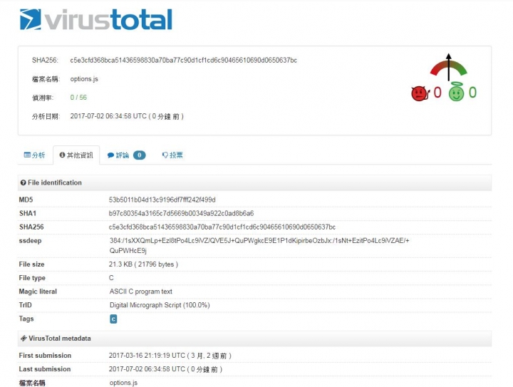 blackleo wrote:我電腦原本沒有安裝Chrome...(恕刪) 再次感謝回報,我掃描的時候都是沒有開啟Chrome的此外,我今天用了另一台電腦來做測試,一樣有安裝Chrome發現還是一樣卡在Chrome的那個檔案上(options.js)所以還是無解,不知道為何會這樣