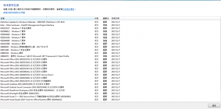 01高手們真的好有人情成功更新了!!!可是更新雖然成功可是又帶來了一個問題就是我沒有看到Windows 7: KB4019264 (五月), KB4015549 (四月), KB4012215 (三月) 這三個檔案更新紀錄想請教前輩們之前努力爬文是說一定要有三個其中一個...我要再另外抓取嗎?還是說最9~10月微軟有出更新的版本..然後我這次更新有成功?