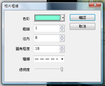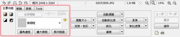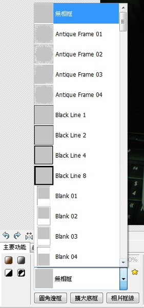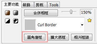 主要功能面板底下,還有三個子功能「圓角邊框」、「擴大底框」、「相片框線」