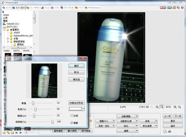 這個功能可以在照片上加上亮點,可以隨意調整星芒的位置、數量、粗細、透明度等等