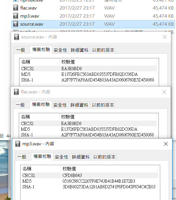 您有沒有將 FLAC 解碼回 PCM 以 WAV 為容器? 所得到的 WAV 跟原本的 WAV 完全一樣的!