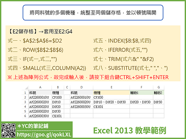 公式須套用至E2:G4{=SUBSTITUTE(TRIM(IFERROR(INDEX($B:$B,SMALL(IF(D2=$A$2:$A$6,ROW($B$2:$B$6),""),COLUMN(A2))),"")&""&F2),"","、")}公式修正1:判斷目標須鎖定D欄的料號公式修正2:是連結一個空格,而非空值公式修正3:是將空格取代成頓號,空值沒辦法做取代