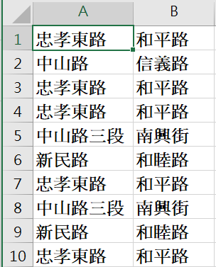 等等,你資料不一定只有一組前後相反的狀況吧?例如可能有些是「信義路-中山路」、有些是「中山路-信義路」可以用C1:「=IF(A1>B1,B1,A1)」D1:「=IF(A1>B1,A1,B1)」往下複製公式以確保每組資料都是相同的排列