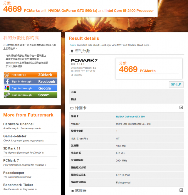 分數2606 PCMarks with NVIDIA GeForce GT 640M(1x) and Intel Core i7-3610QM Processor想請教一下為何我的上周才剛買的acer v3分數如此低啊...http://3dmark.com/pcm7/359688