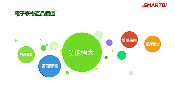 使用者只需具備Excel基礎技能,並理解資料自動擴展的原理,便能設計出各式各樣的報表、圖形,實現儀表板、分析報告、What-if等常見BI應用。想要做出漂亮圖形也不用擔心,Smartbi幫你做好各種配色的模板