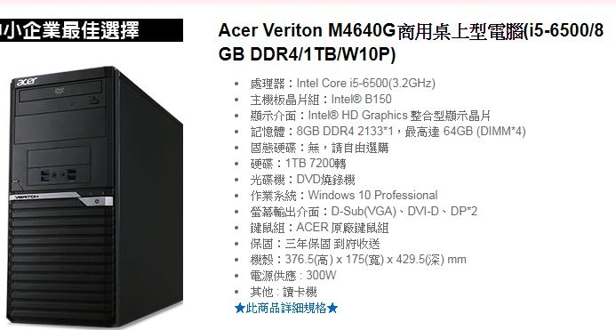 共進了 5 台這款電腦 Acer Veriton M4640G (Non OS / i6-6500 / 8G / 1T)