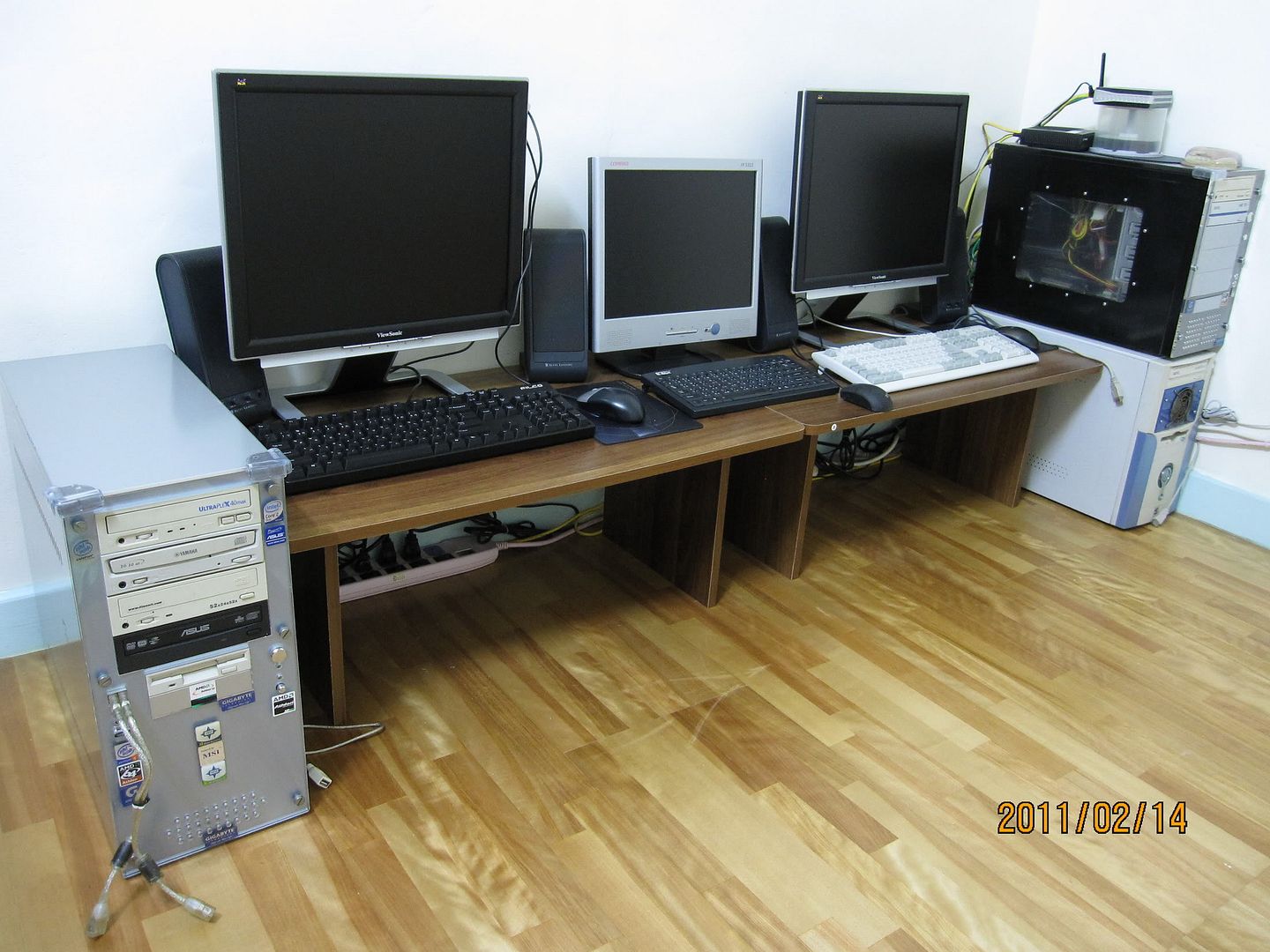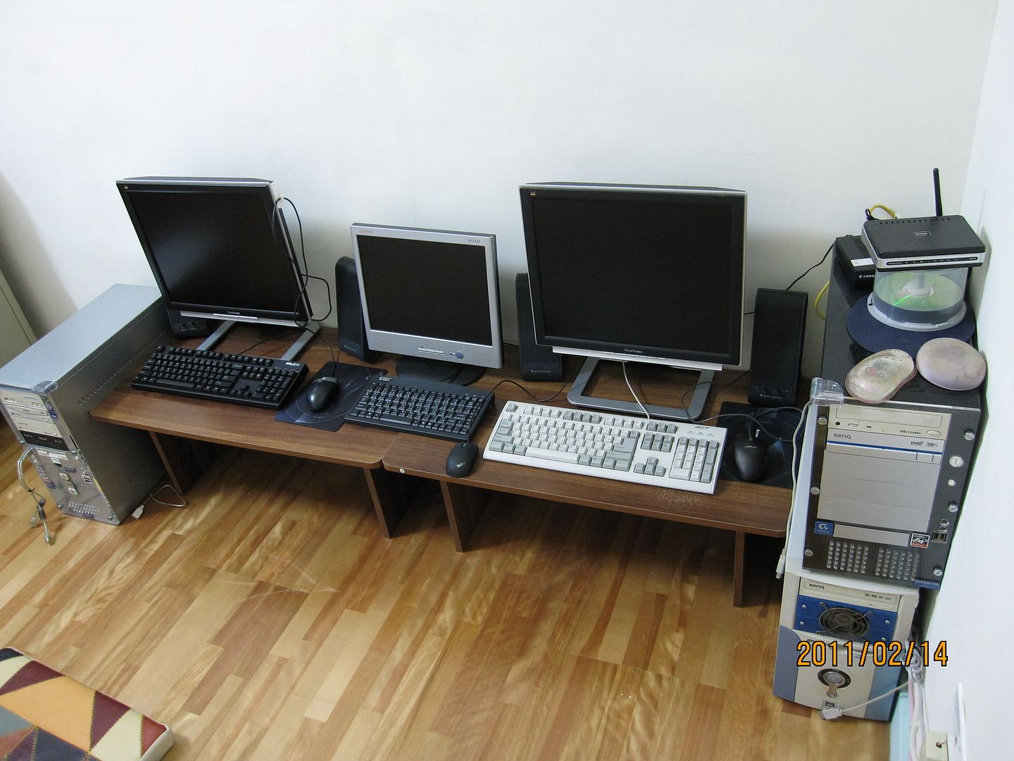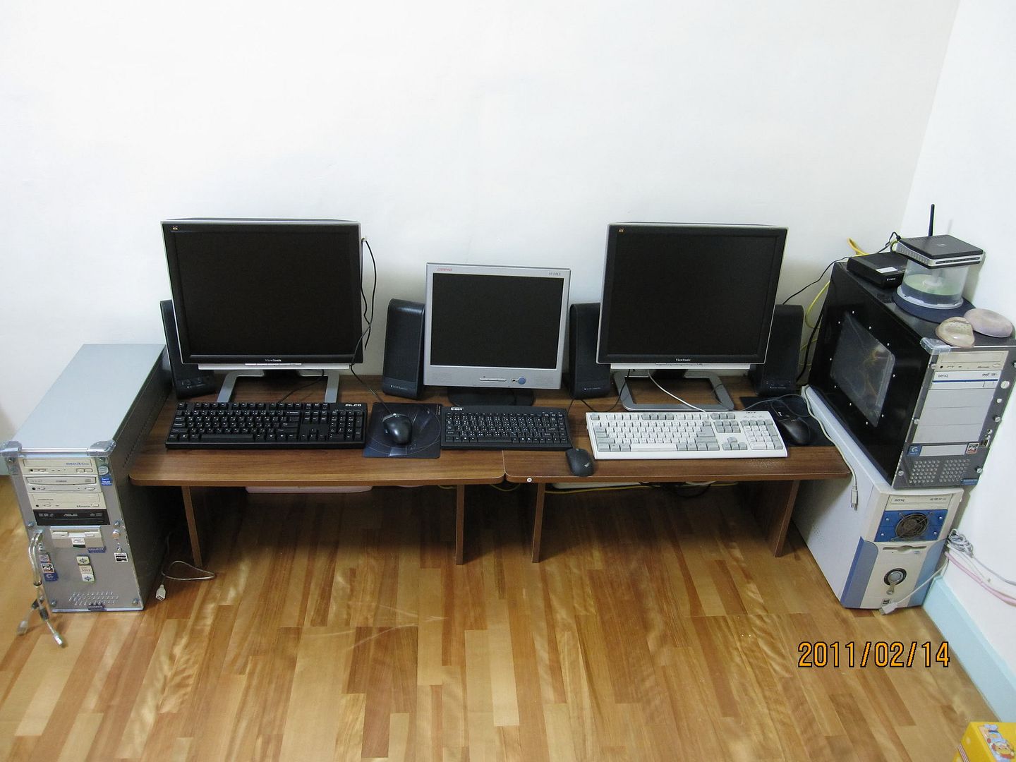 既然版大都開了這個主題,小弟也來獻醜了...因為小弟是個很念舊的人,所以舊的零件都不肯丟,就把它們拼湊成三台堪用的電腦,看螢幕和機殼就知道都有一定的年紀了,至少都有4~6年的歷史了,傷眼莫怪喔!就從左、中、右的視角切入拍攝吧!主機外露的稜角部份都有貼防撞條,避免家裡的幼兒不小心去撞到而受傷喔! 而無線基地台擺放的位置有經過測試,家裡三層樓各個房間都能收到無線訊號,且訊號強度都不錯!所以這三台電腦只是我的作業機,家人的其他電腦就不PO圖上來了,現在家庭擁有三台以上的電腦應該都是稀鬆平常的,只是我都是用舊規格的主機。電腦夠用就好,沒有必要求新求變,給大家參考一下非主流01敗家傳統的電腦桌面吧!