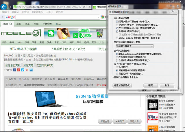 Winkseam wrote:那是因為你輸入的網址...(恕刪) 謝謝您在請問一個問題我現在在這網頁在搜尋一個網頁,我在右上按X變成直接整個關閉網頁之前要按X好像有個顯示提示會出現 您是否要關閉目前索引?? 還是整個關閉...? <--這選項要在哪裡恢復呢?