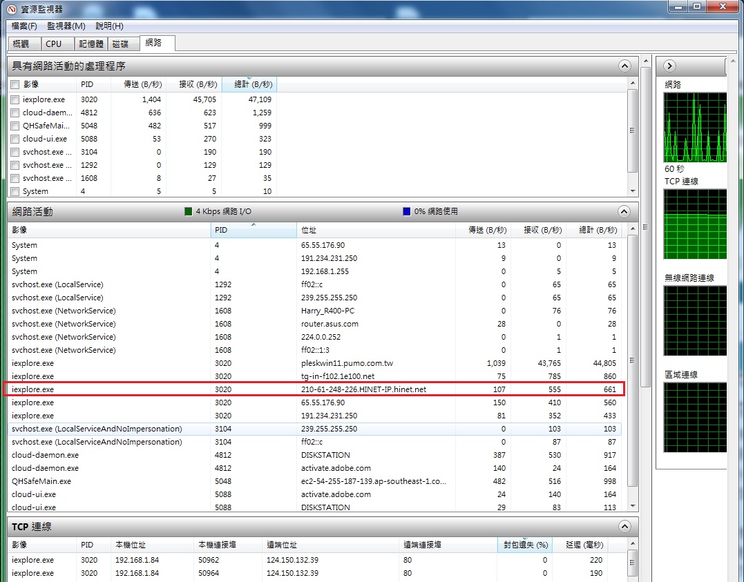 最近電腦網路速度明顯有點慢,打開資源監視器中的網路連線,會一直出現有XXX.XXX.XX.XXX-HINET-IP.hinet.net的網址!!小弟嘗試搜尋但卻沒有任何相關的答案,才上來請各位幫忙。詢問過中華電信電話客服,對方指示這個位址不是正常的位址。小弟發現當我用IE或是google時,網頁剛開時會大量出現類似的位址,但一段時間這位址就會消失,或是關閉網頁時,這些位址也會消失!!類似情形,請看下圖。請大家幫忙,若確定是中木馬或是病毒,那年假就要來重灌了@@"先謝謝大家!!