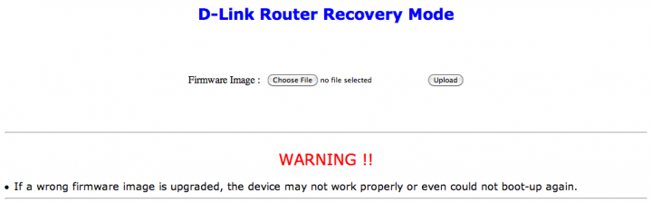 8. Wait for the D-Link Router Recovery Mode page to load (See Exhibit 1 below)