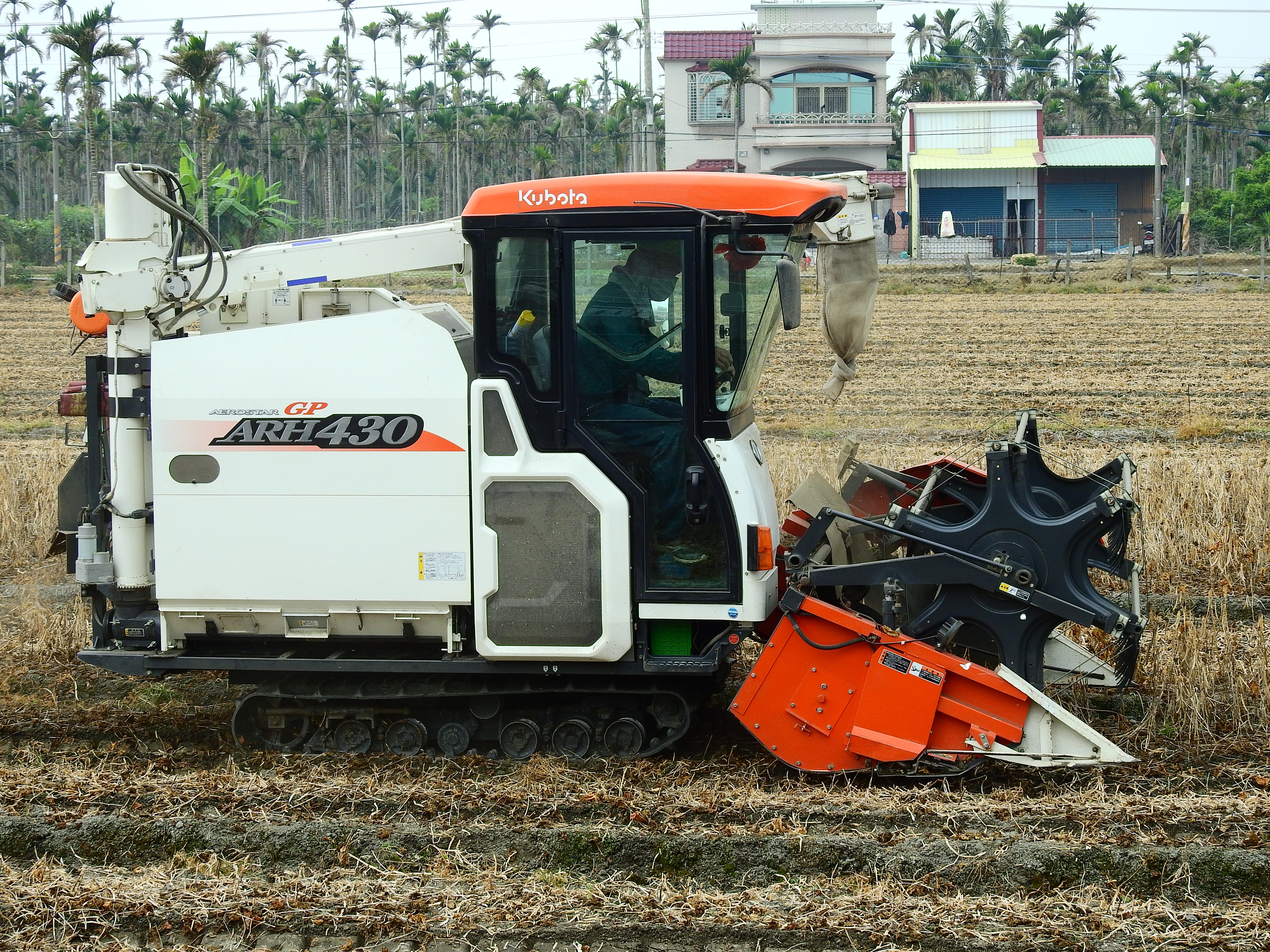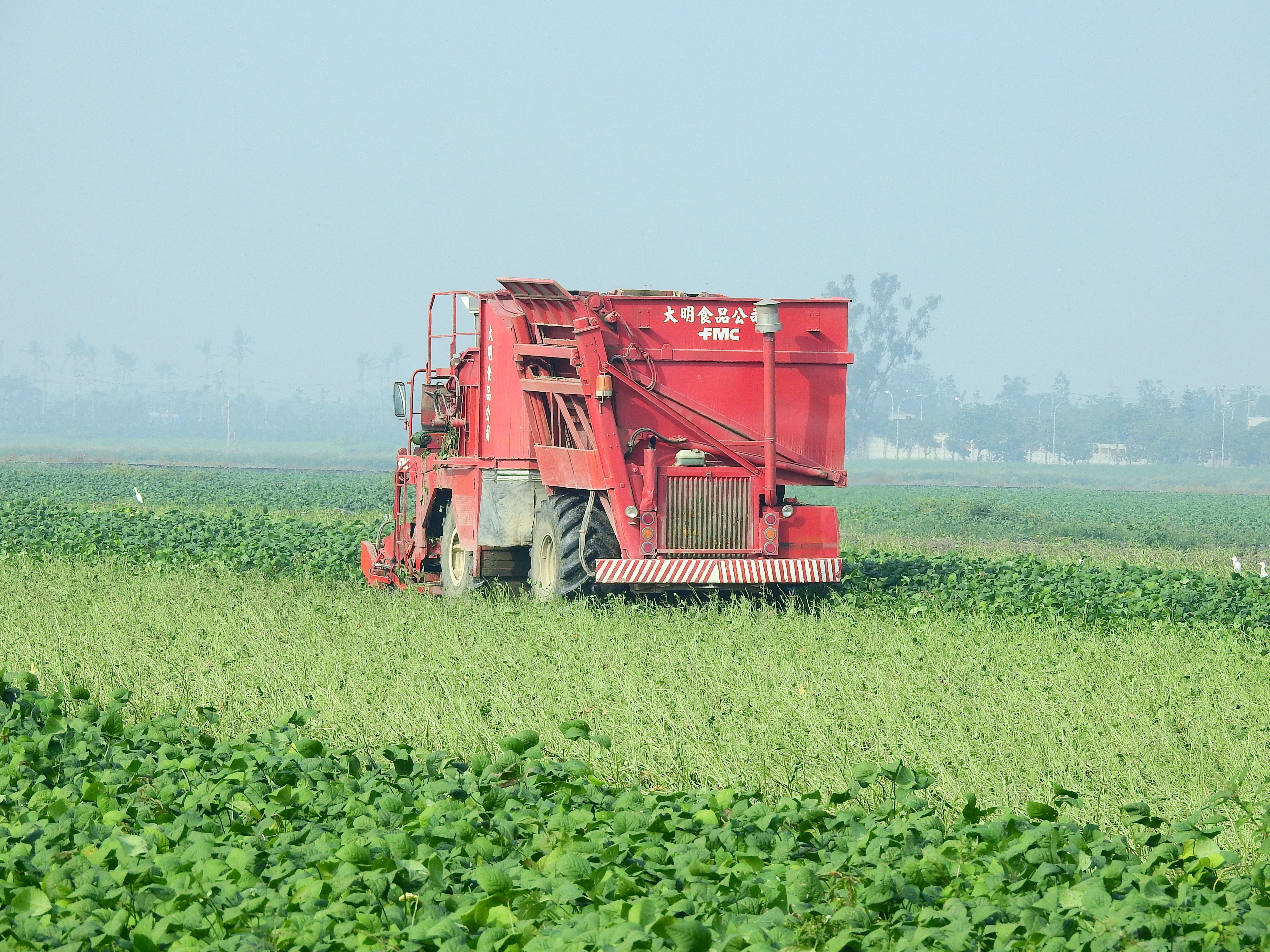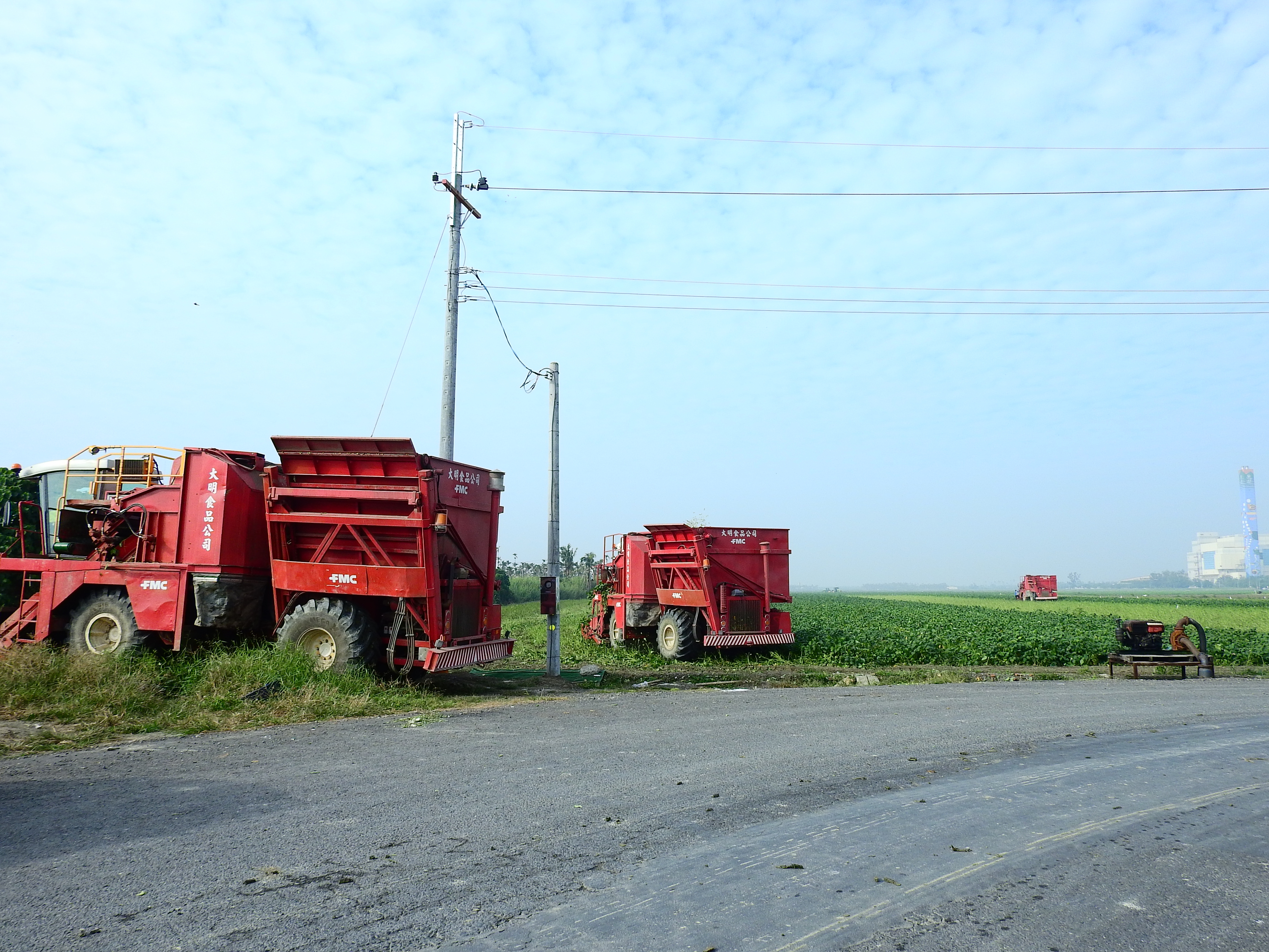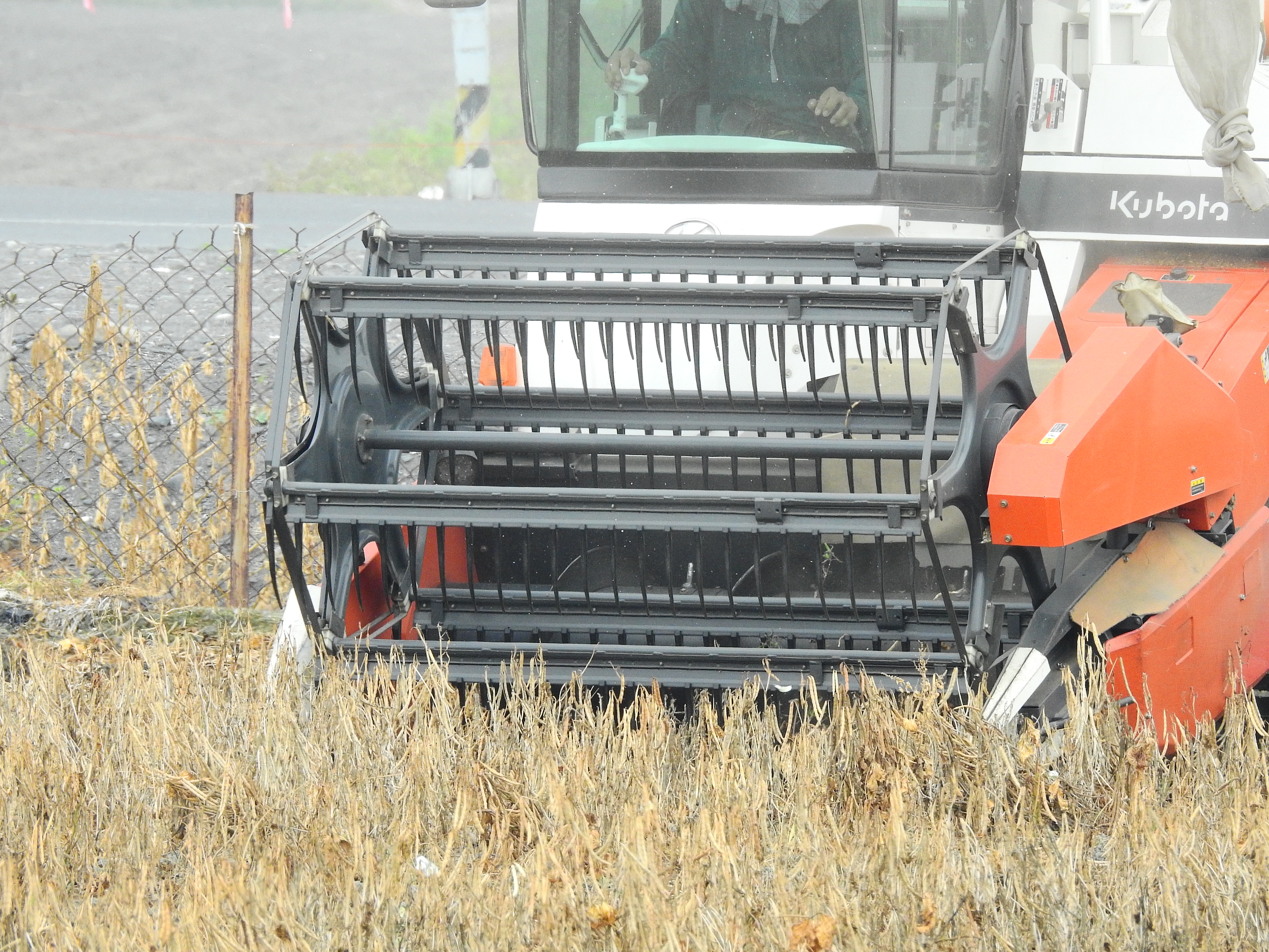因為毛豆田面積大,常好幾部毛豆採收機同時採收。