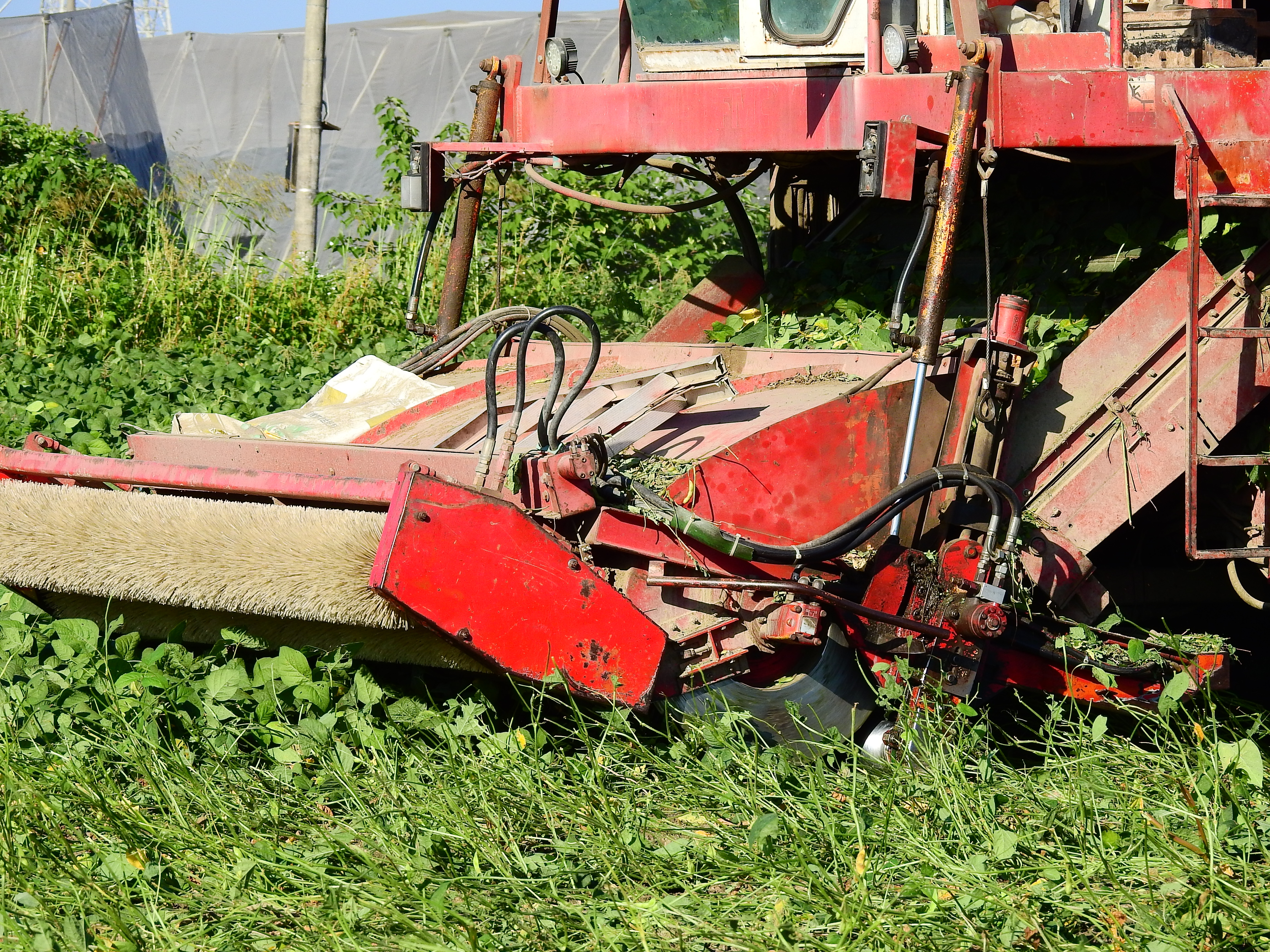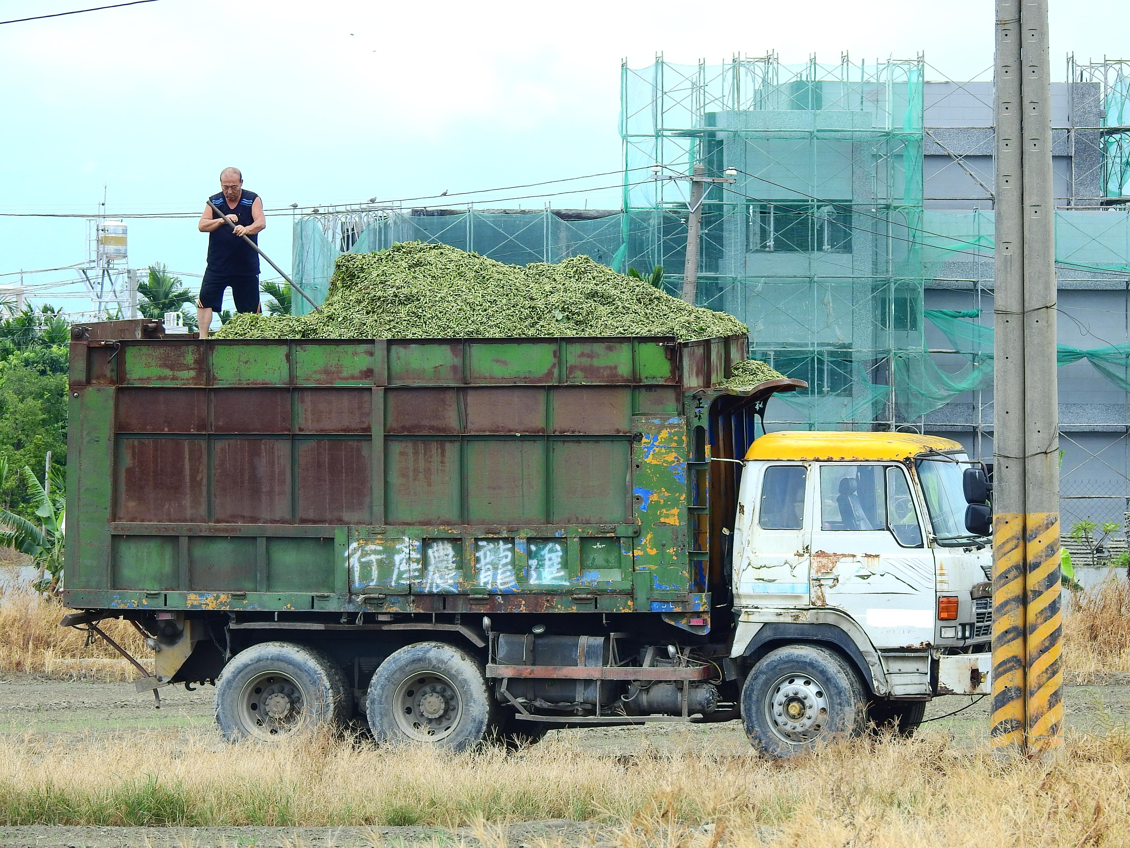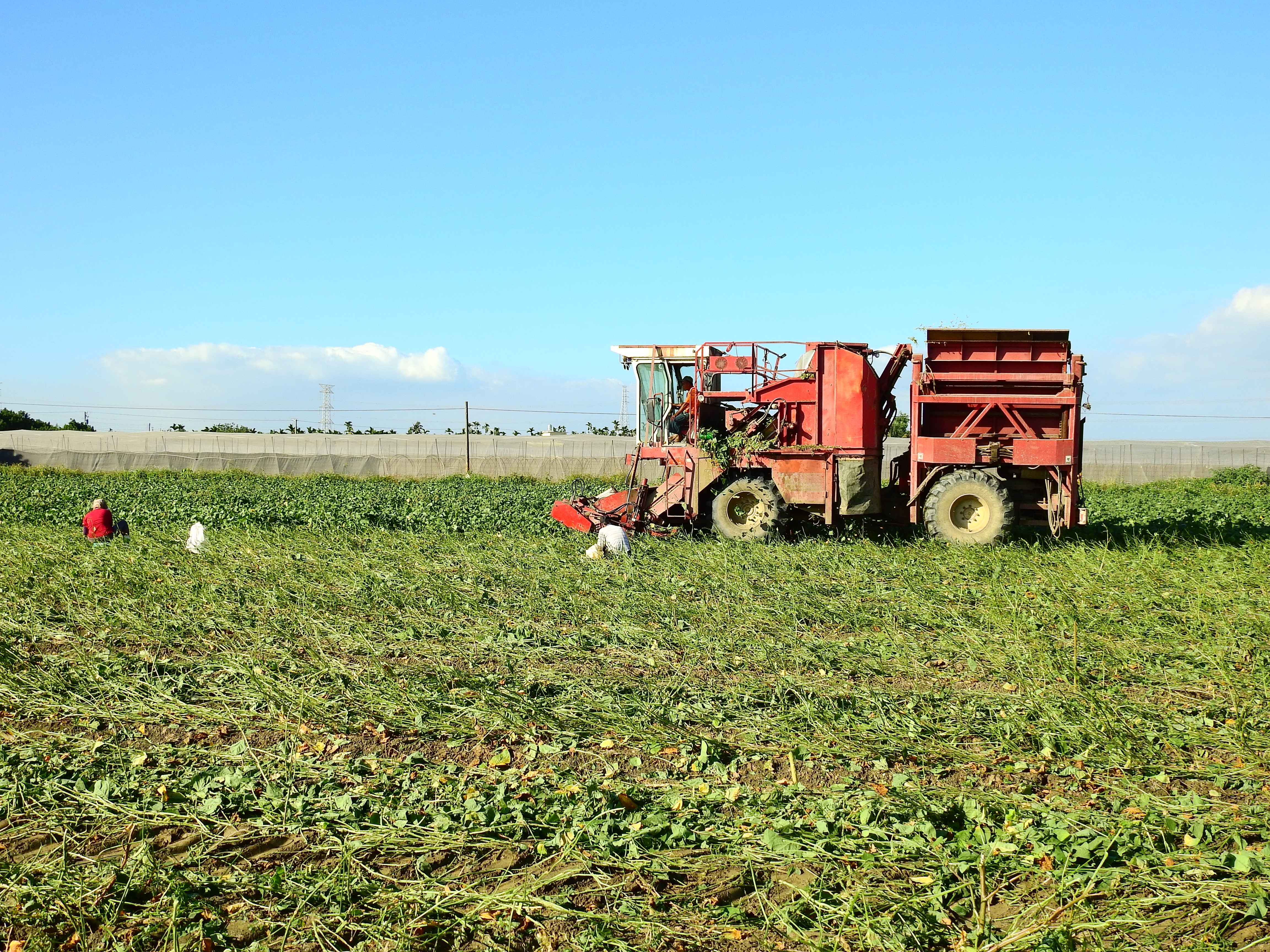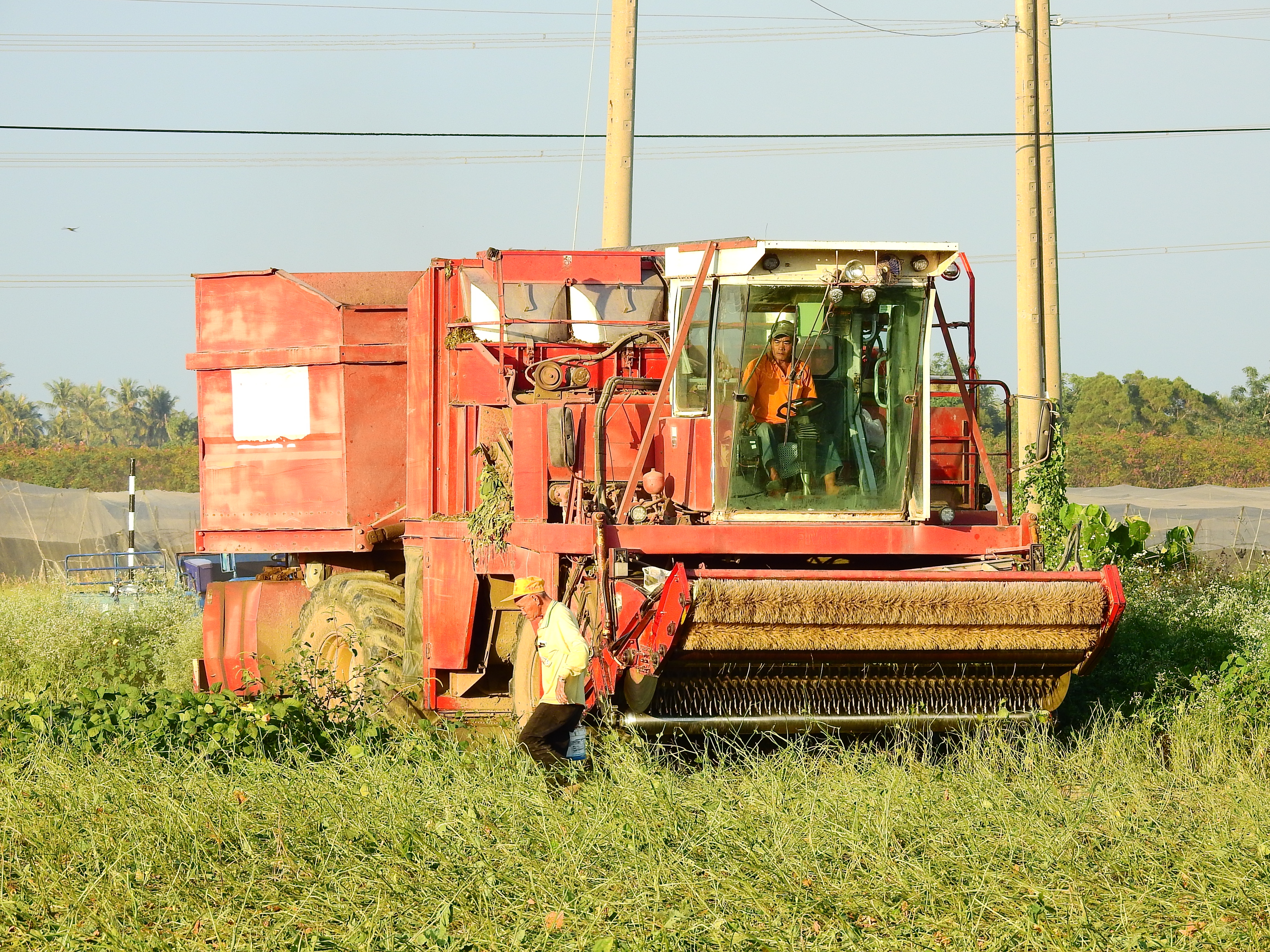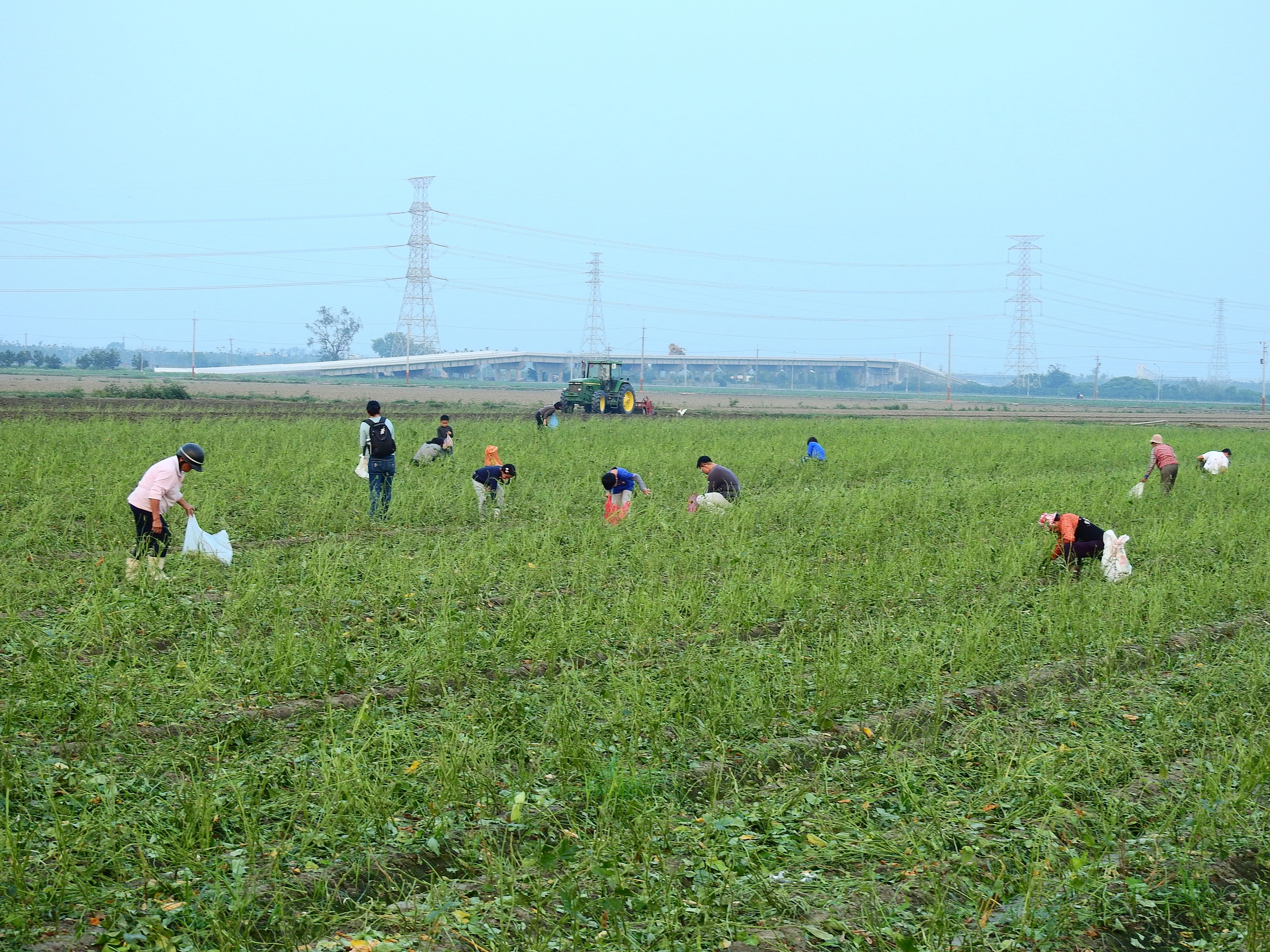 因為毛豆田面積大,常好幾部毛豆採收機同時採收。