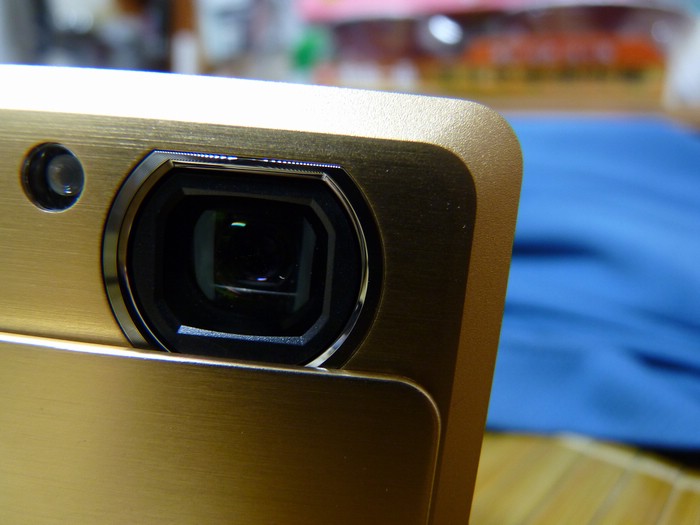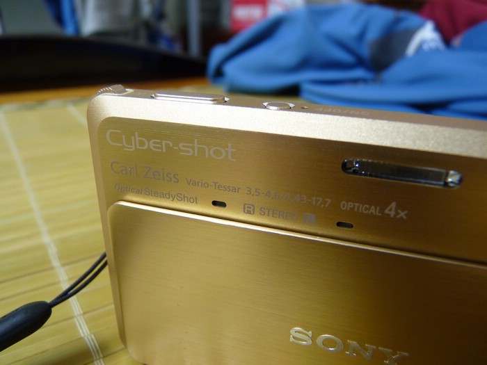 滑下前蓋,採用蔡司鏡頭(我相信比W350貴用的鏡片品質也一定比較好),雖然最大光圈只有3.5,但是望遠端仍有4.6,已經贏過幾乎所有的其他相機,有雙麥克風錄影,立體聲錄音效果很棒