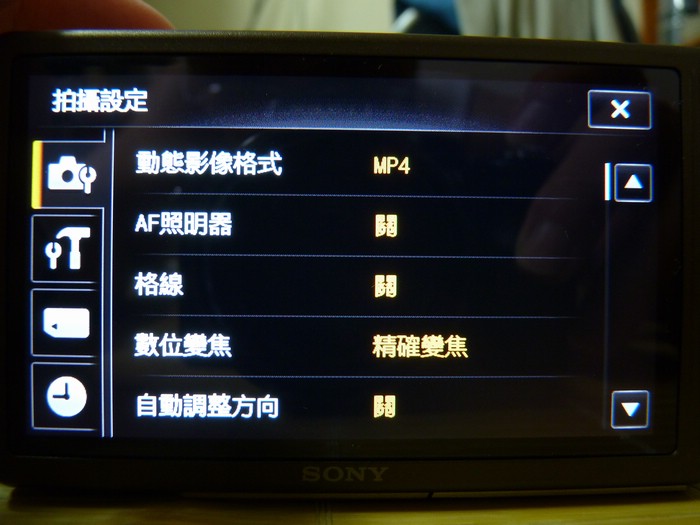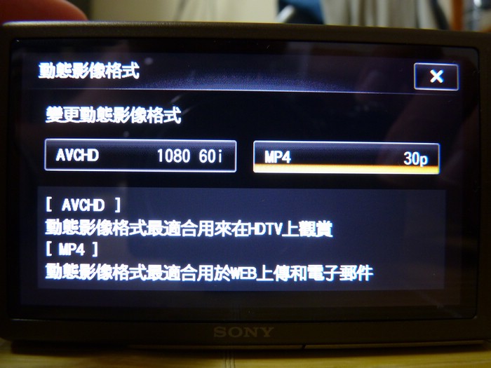 很重要的錄影選項,錄影是SONY的強項,也是我會買TX9的原因,AVCHD以每秒60格錄影,真的超流暢喔,相較下MP4的每秒30格就沒那麼好,但是也贏過市面上一堆相機的錄影功能了