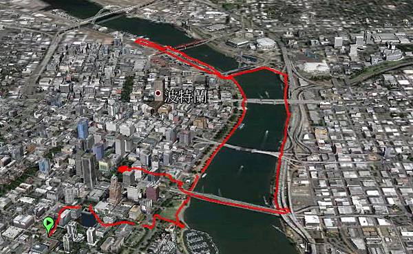 對岸兩根尖尖的建築物是奧瑞岡會議中心(Oregon Convention Center)。波特蘭是奧勒岡州最大的城市,不過城並不大。