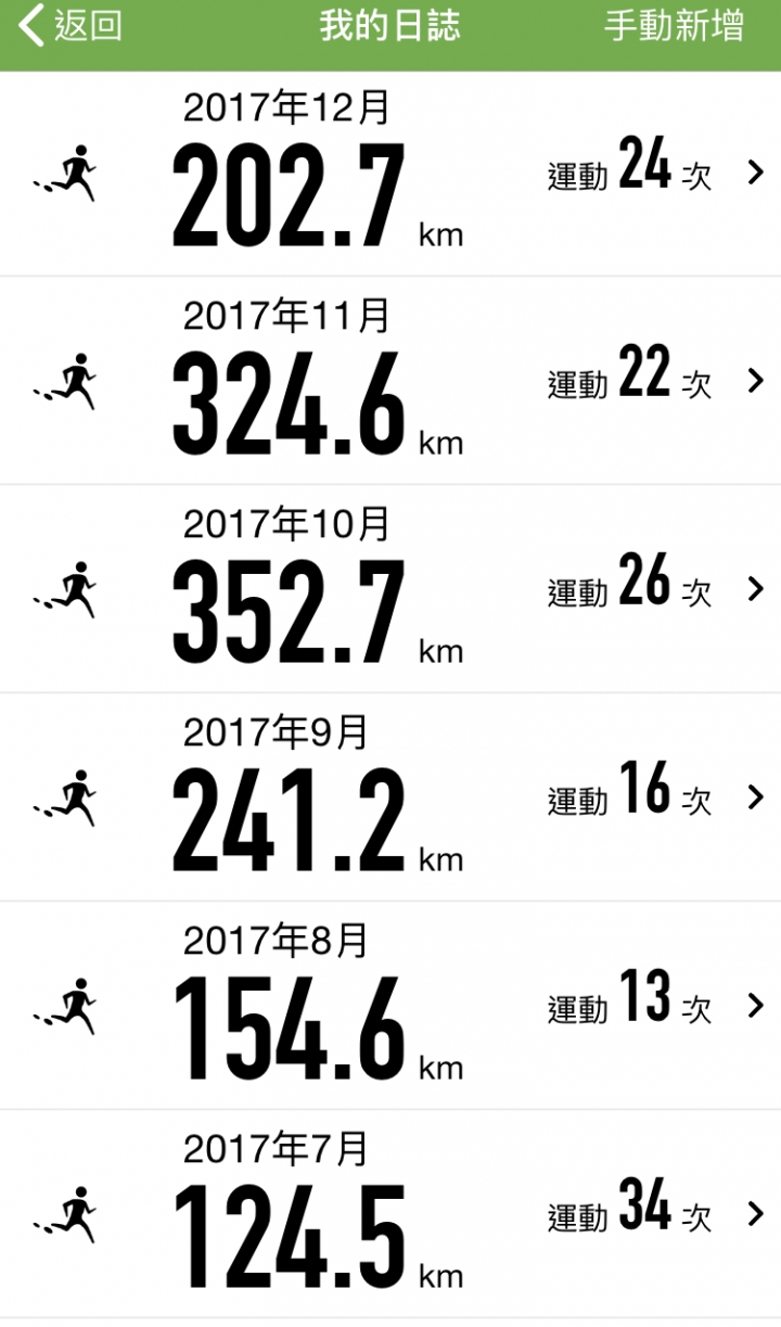 jerry.lee.taipei wrote:一年不到就快超過一...(恕刪) 我的課表集中在河濱狂練半馬5'10"配速, 習慣這個配速後要在平地馬定速巡航35K應該就沒太大問題了,SUB4也比較有信心然後月跑量300將會是基本盤偶爾會在操場第一跑道飆100分內半馬, 所以大致上快慢都有練到(唯獨沒有練間歇)52.5圈真的很虐心2017渣打馬拉松希望能335(第三馬)2018萬金石難度大目標340就好(第四馬)我還很嫩 全馬330似乎要再多練練才有把握....