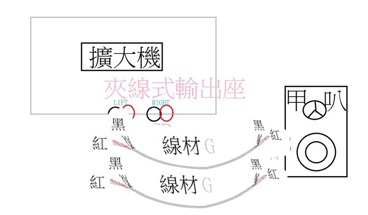 想問該如何夾?才可以讓單顆喇叭(圖下:甲叭)同時吃到擴輸出的左+右的音訊?