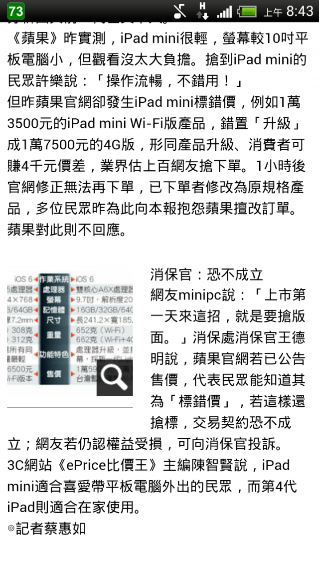 acer wrote:樓主真的太愛蘋果,可稱上今年度最愛蘋果的粉絲被騙還是幫忙擦屁股,冷靜想想吧,有必要愛成這樣!!??..(恕刪) 不好意思喔~~~我不算是真正的蘋果迷因為我的手機現在是HTC的只有平板是NEW iPAD....現在只是幫老婆買一台iPAD mini這跟蘋果迷沒關係....也希望你不要用蘋果迷來模糊焦點!!