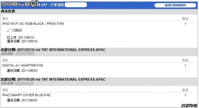 我也是27當天凌晨上官網下單一台黑一台白跟smart cover不過10點多還是去燦坤排隊10點半就都到E-MAIL通知出貨不過是smart cover順利買到白色 IPAD2後就上網取消訂單不過smart cover已經出貨不能取消今天早上10點我就收到smart cover了結果是新加坡寄來的我原本還以為是從大陸寄來現在正考慮要退掉,還是要留著。