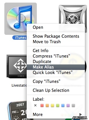 到你的應用程式(Applications)目錄下, 點選iTunes程式然後叫出選單, 選擇 "Make Alias" 選項, 就會產生檔名為 "iTunes Alias"的檔案.