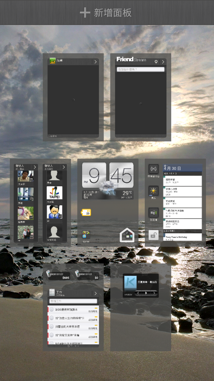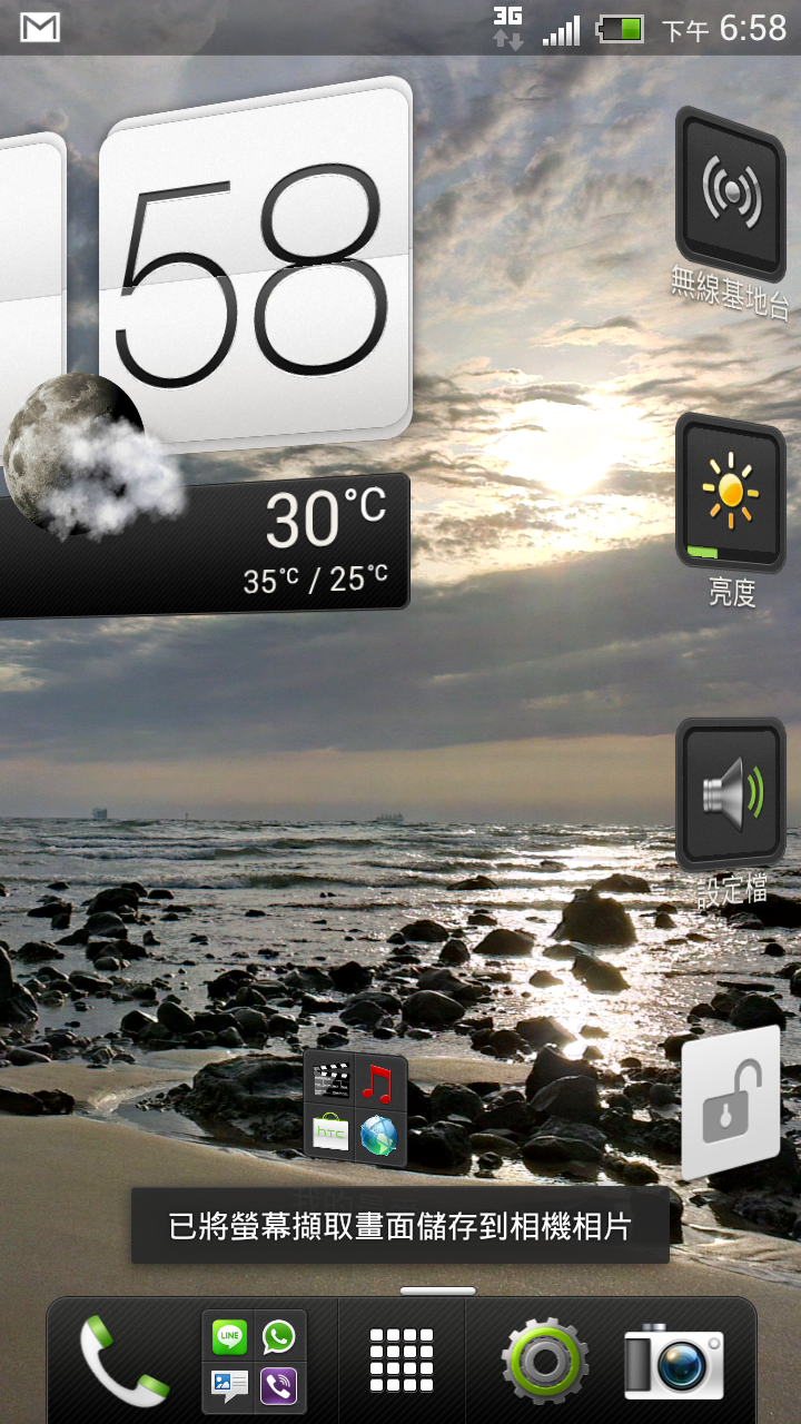 這次Sense4.0的介面做了相對於以往算是很大的改變,最主要就是下面的icon部分。這次改成五個icon,另外除了中間的程式以外,另外四個與滑動解鎖做了結合,只要把程式拉到下面,自動會成為滑動解鎖畫面的那四個功能。