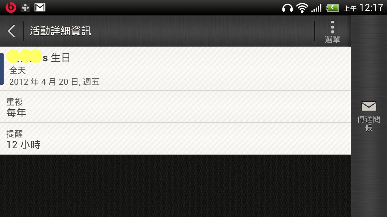 其他那四筆,就是記錄在"聯絡人"裡的生日。也就是說,如果你在設定聯絡人時,記得順便設定他的生日,就會自動出現在行事曆中提醒你了,我一直覺得這是一個很貼心的功能!(只是不知道為什麼這段時間反而沒人注意到這個小地方就是了)